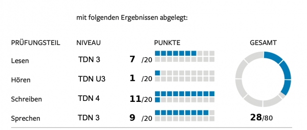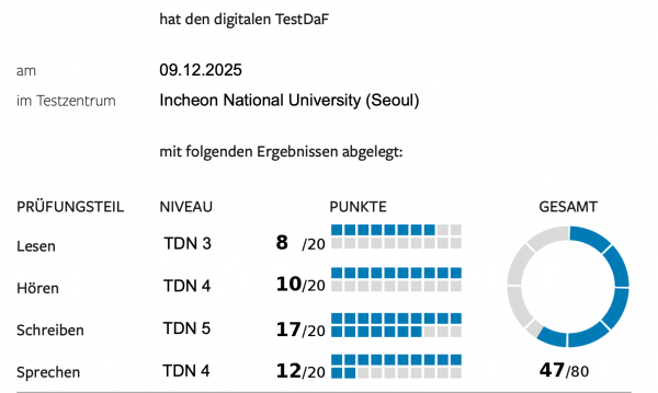 저는 기초가 많이 부족한 상태라 Lesen영역이 끝까지 아쉬운 점수였는데,,, 쓰기와 말하기에 자신이 없는 분들은 저의 성적표를 보시고 독정에서 다프 준비를 추천드리고 싶어요! 또한 파피어와 디지털 버전 모두 독정에서 제공하고 있으니 어떤것을 볼 지 상담 또한 하시면 좋은 결과 있을겁니다 ㅎㅎ